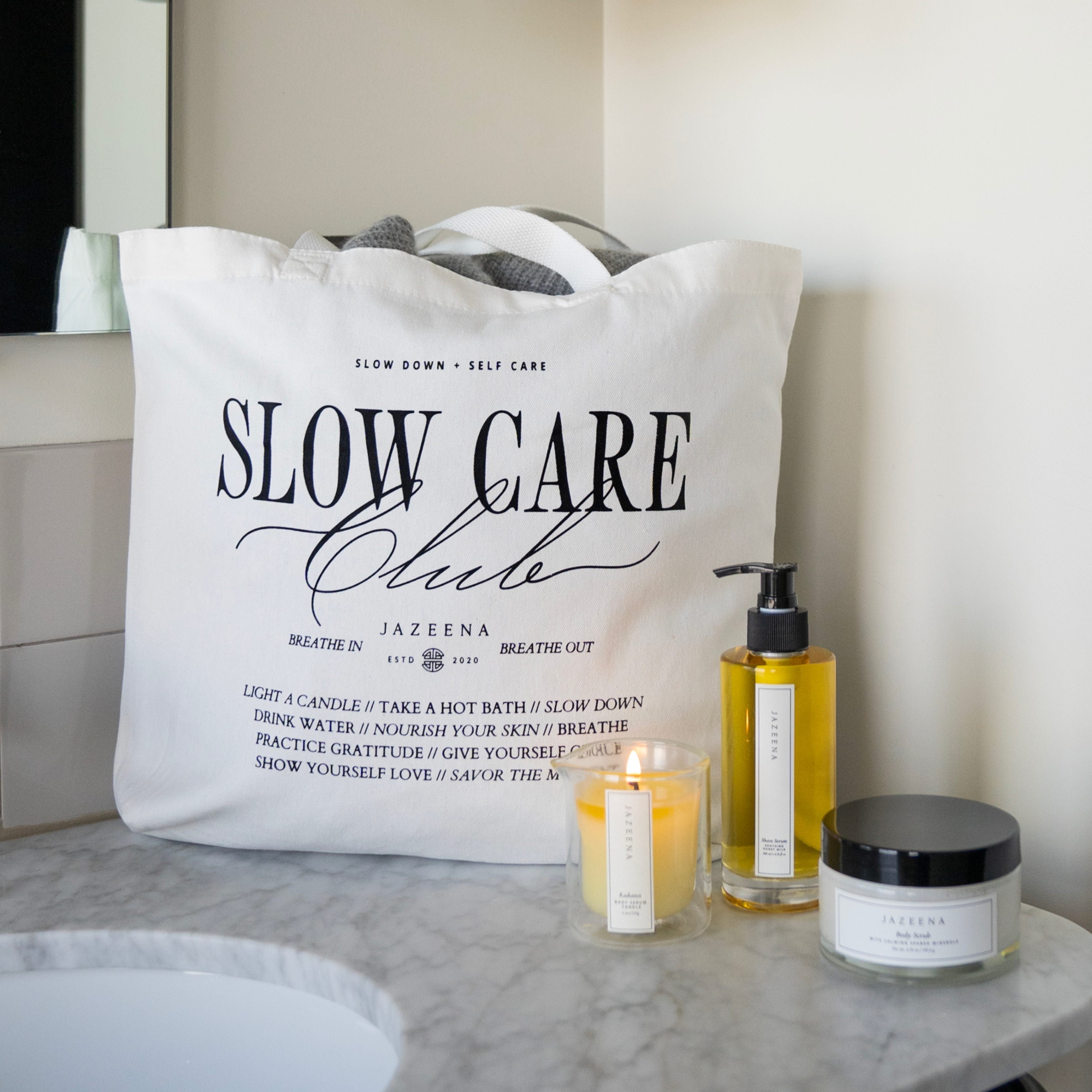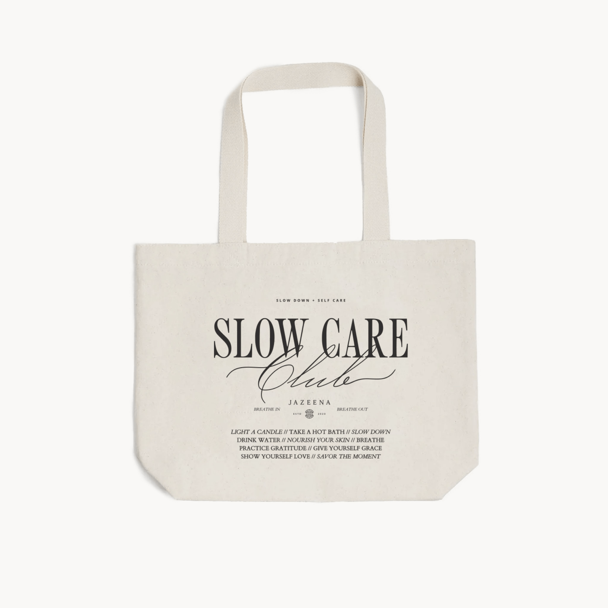 Embrace the art of slowing down with this thoughtfully designed tote bag. Crafted from lightweight, durable natural cotton, it’s both practical and versatile for everyday use. The spacious main compartment offers ample room for your essentials, while the inner pocket keeps your phone, keys, and other necessities easily accessible. This tote serves as a gentle reminder to prioritize self-care, no matter where your day takes you.