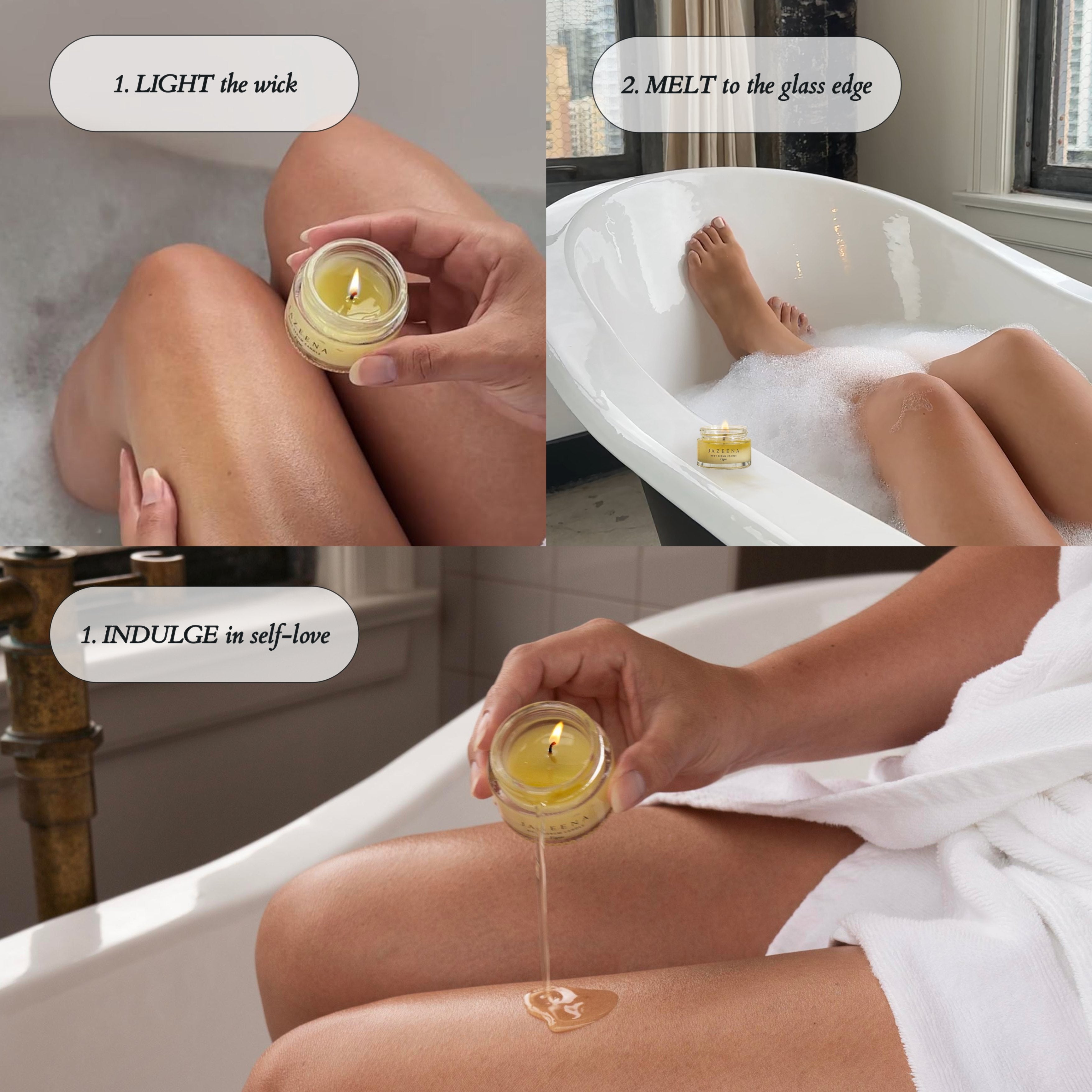 Light the wick until the serum melts to the edge of the glass. Extinguish the flame, pour a small amount onto your hands, and gently massage onto your body. Lasts ~6 months depending on use.