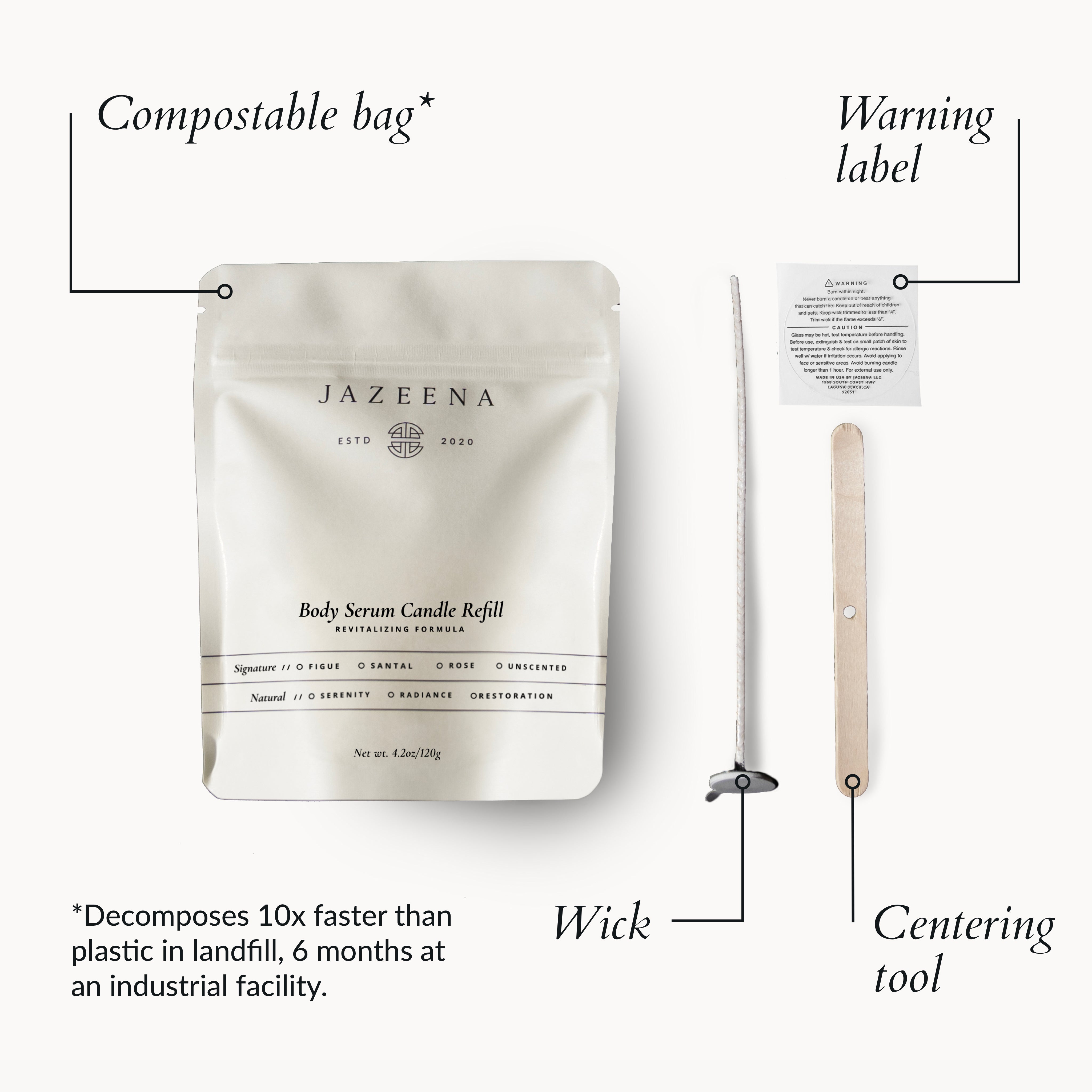 Microwave the refill for 45 seconds, pour melted serum into your clean vessel. Cool for 2 hours before use. Trim the wick, light and enjoy.